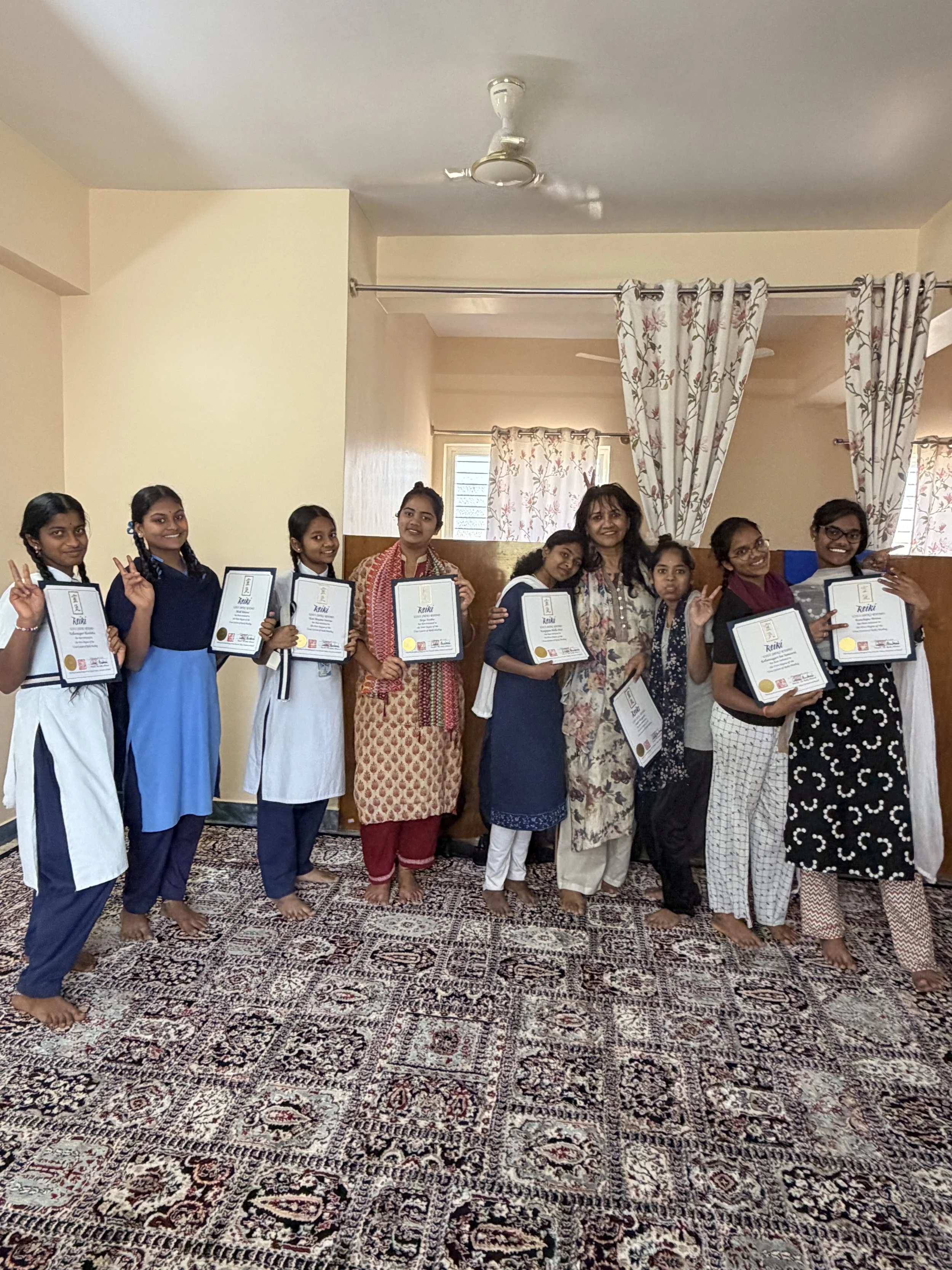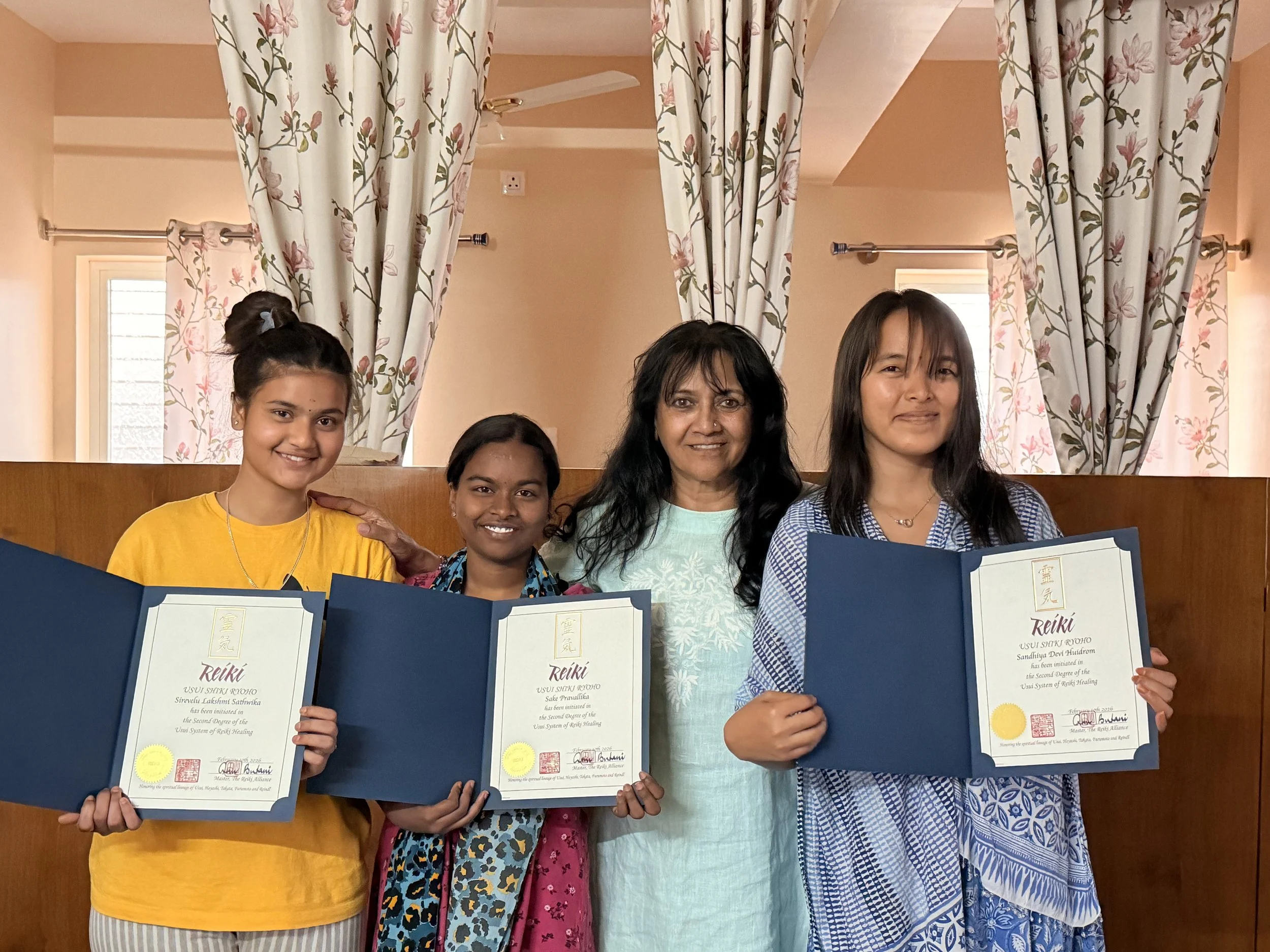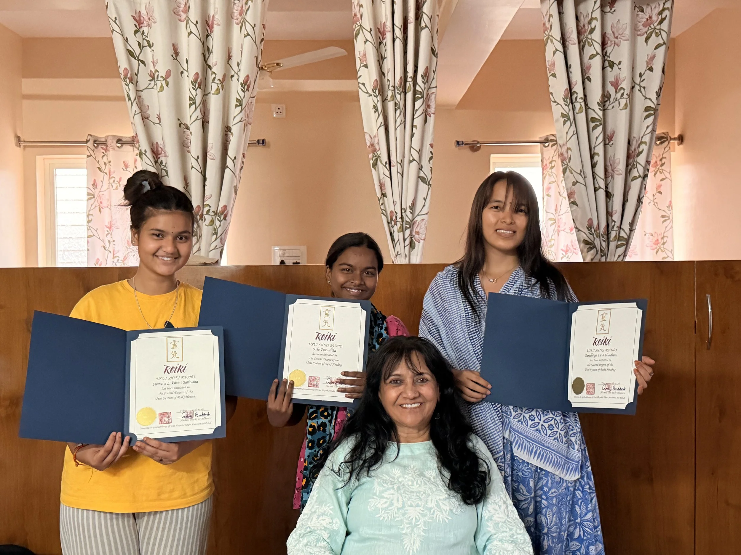 Several girls have now successfully completed Reiki Level 1 and Reiki Level 2 training, receiving their certifications with sincerity and commitment.